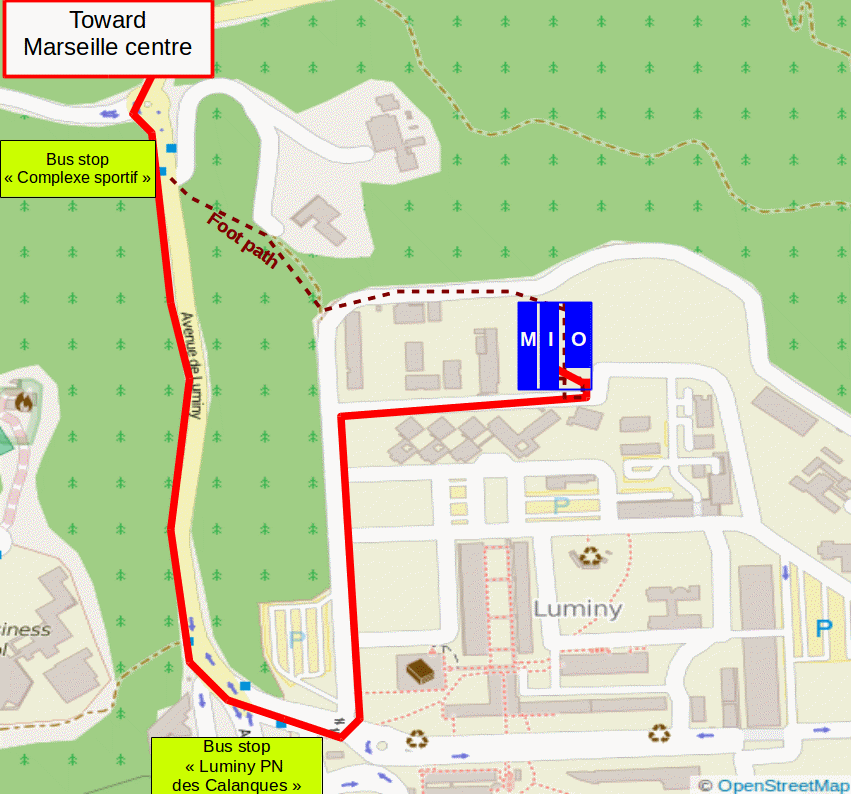 The metro leaves directly from the train station. Take metro M2 towards "Ste-Marguerite-Dromel" and get off at "Rond-Point du Prado" (metros go from 5 am to 10 pm). After exiting the metro station, cross the street to the bus stop and take the bus lines B1 or 21JET until the bus stop "Luminy PN Calanques" (duration : about 30 minutes). All bus schedules are available at www.rtm.fr