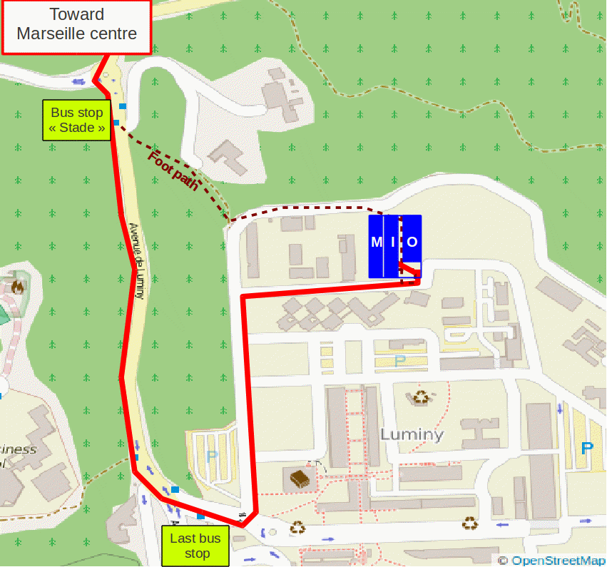 The metro leaves directly from the train station. Take metro number 2 towards Ste-Marguerite-Dromel and get off at "Rond-Point du Prado" (metros go from 5 am to 10 pm). After exiting the metro station, cross the street to the bus stop and take the bus line 21 to Luminy terminal. Weekdays, buses leave every 15 minutes between 5.15 am and 9.00 pm. The last bus leaves at 9.10 pm from "Rond-Point du Prado" towards Luminy Terminal). Trip duration : about 35 minutes, price about 1,70 euros (be aware that the bus drivers do not make change). All bus schedules are available at www.lepilote.com
